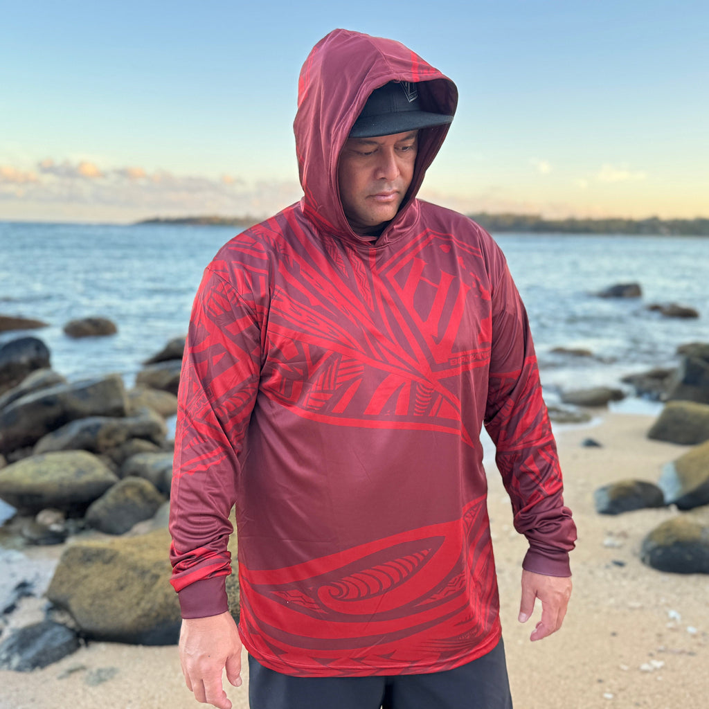 This is a Born Hawaii drifit hooded longsleeve warm up in shades of Red. Featuring Polynesian Tattoo designs in FULL COLOR printing ALL OVER front and back.