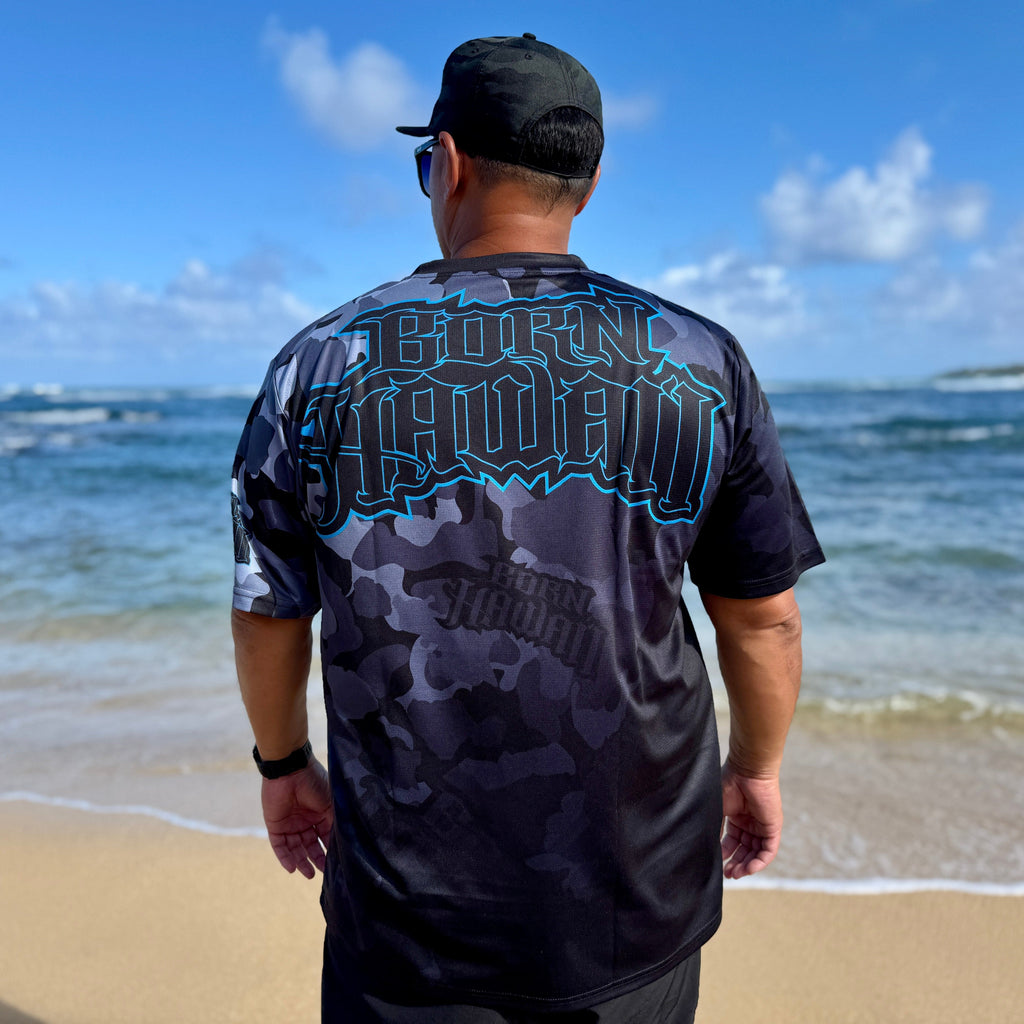 Our Born Hawaii short sleeve Dry Fit Jersey in Black, Grey and Blue Camo Design. Featuring Polynesian Tattoo designs in full color printing both front and back. Feel cool and comfortable all day long in our Moisture Wicking Dry Fit Mesh material.