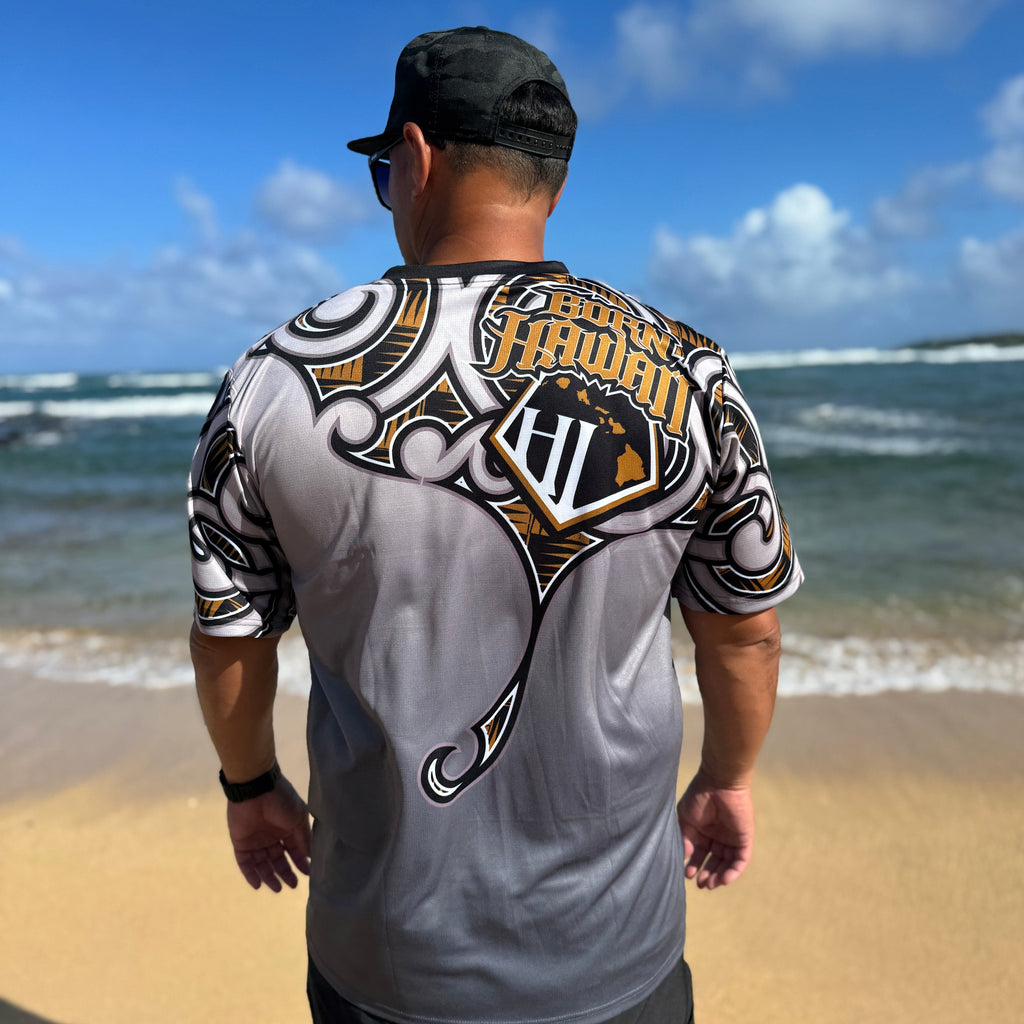 Our Born Hawaii short sleeve Dry Fit Jersey in Tan and Beige Kupu Design. Featuring Polynesian Tattoo designs in full color printing both front and back. Feel cool and comfortable all day long in our Moisture Wicking Dry Fit Mesh material.