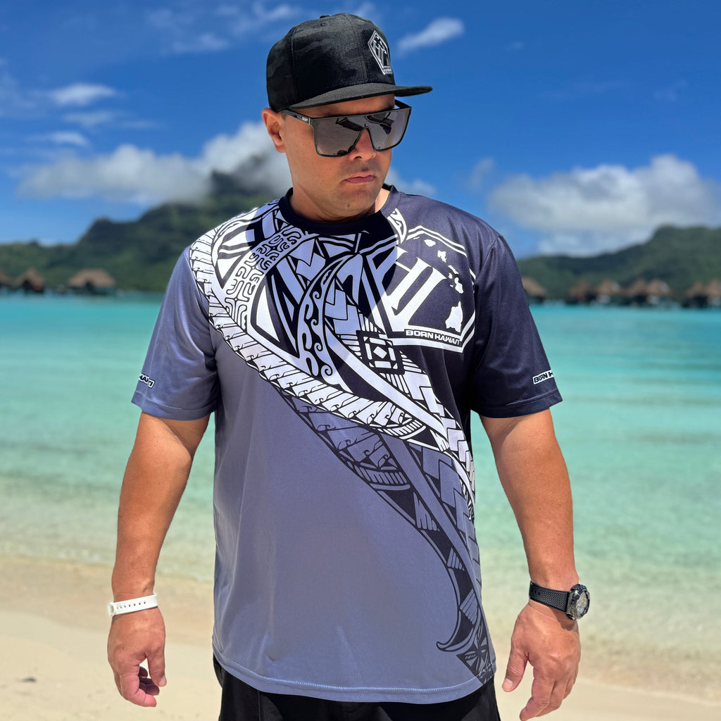 Our Born Hawaii short sleeve Dry Fit Jersey in our shades of Grey Savage Design. Featuring Polynesian Tattoo designs in full color printing both front and back. Feel cool and comfortable all day long in our Moisture Wicking Dry Fit Mesh material.