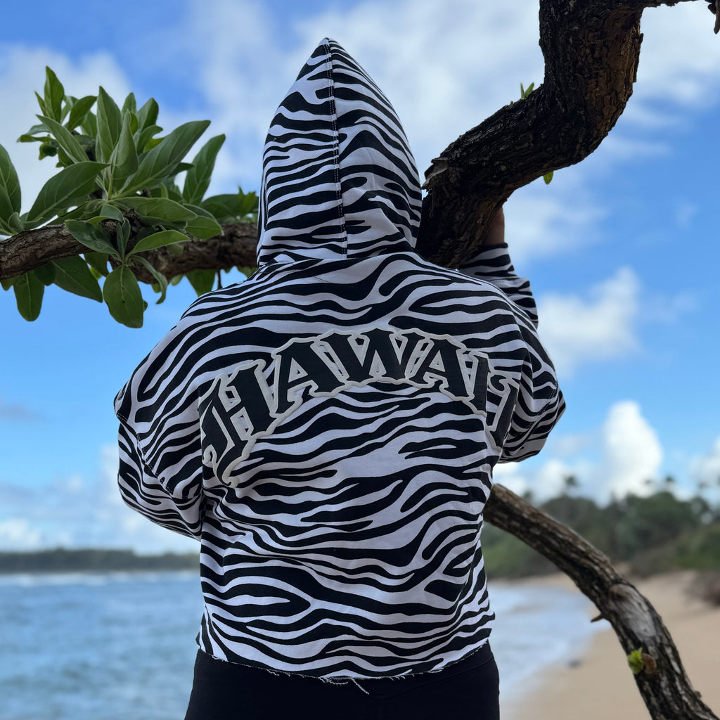 Our Women Tiger Print CROP Pullover Fleece Hoodie with front embroidery and oversized printing on the back.