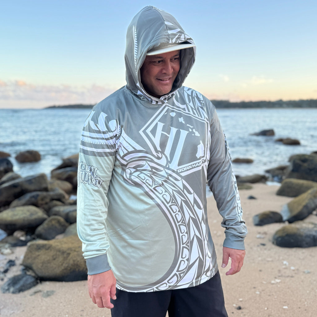 This is a Born Hawaii drifit hooded longsleeve warm up in Sage. Featuring Polynesian Tattoo designs in FULL COLOR printing ALL OVER front and back.