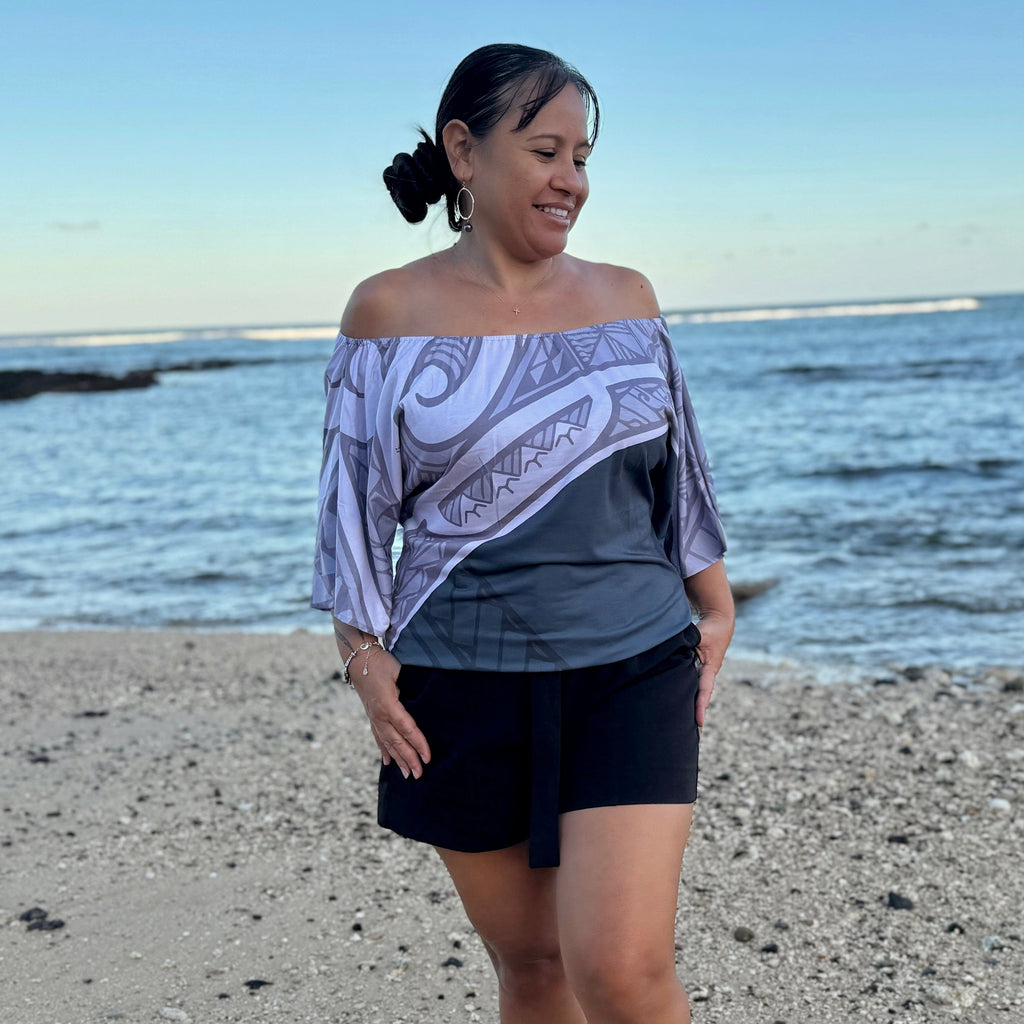 This is a Brown Tonal Polynesian tattoo patterns off the shoulder top with 3/4 length sleeve. Super cute and comfortable. Pair it off with shorts for a casual look or dress it up with a pencil skirt for an evening wear.