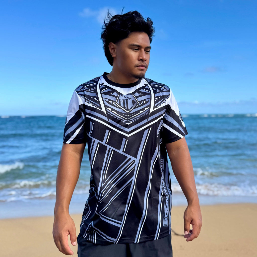 Our Born Hawaii short sleeve Dry Fit Jersey in Black, Grey. and White Wakanda Design. Featuring Polynesian Tattoo designs in full color printing both front and back. Feel cool and comfortable all day long in our Moisture Wicking Dry Fit Mesh material.
