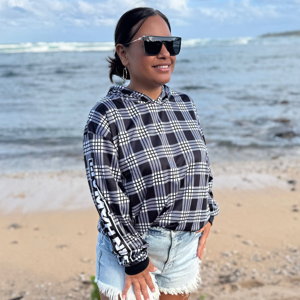 This is a Born Hawaii drifit hooded longsleeve warm up in Black and White Palaka design. Featuring Polynesian Tattoo designs in FULL COLOR printing ALL OVER front and back.