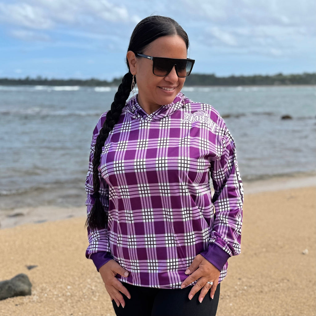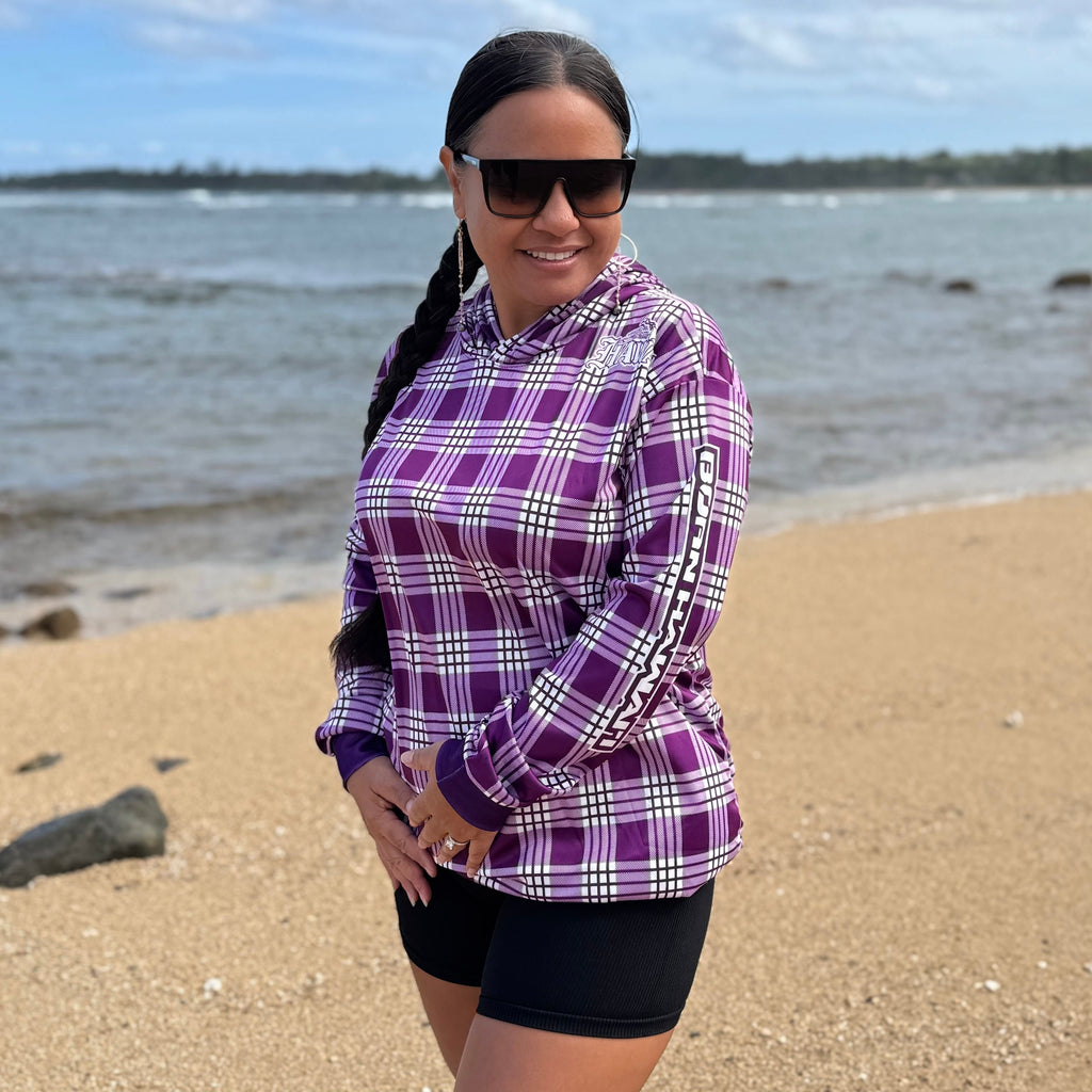This is a Born Hawaii drifit hooded longsleeve warm up in Puple and White Palaka design. Featuring Polynesian Tattoo designs in FULL COLOR printing ALL OVER front and back.